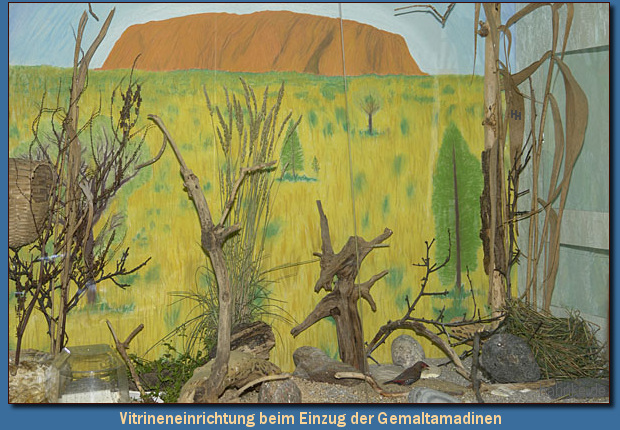 Die Vitrine sollte für den Bodenbrüter bestens gerüstet sein. Neben einem Nistkorb auf halber Höhe (links) und einem Nistkasten ganz oben, wurden mehrere Nistmöglichkeiten am Boden geschaffen. Aber es sollte anders kommen...