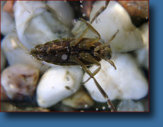 Ungefähr so groß wie eine Wespe kann dieser Gemeine Rückenschwimmer auch ähnlich unangenehm zustechen, allerdings mit seinem hier gut sichtbaren Stechrüssel.
