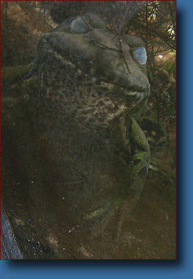 Dieser ausgewachsene Wasserfrosch sitzt gerade direkt an der Glasscheibe und hat die Augen geschlossen. Trotzdem kann er auch unter dem Eis jederzeit reagieren und blitzschnell seinen Standort wechseln. Weil er - leichter als Wasser - mit Auftrieb zu kämpfen hat, muss sich der Frosch unter geeigneten Strukturen am Teichgrund halten können. |